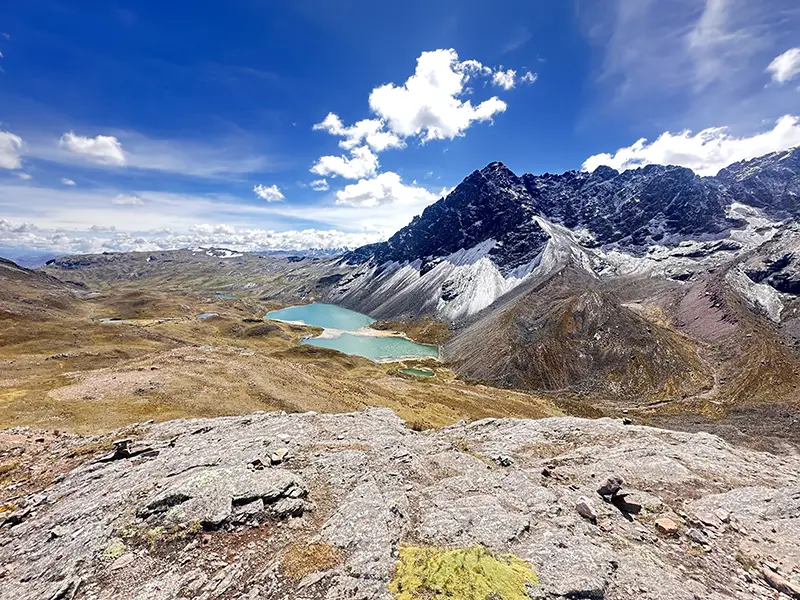 Por la tarde, reanudaremos nuestra caminata con un suave ascenso de 2.5 horas hacia nuestro segundo punto más alto del día: el Paso Ausangate (4700 m / 15 419 pies). Desde la cima, nos deleitaremos con vistas increíbles del nevado Ausangate y el lago Ausangatecocha, de color turquesa, formado por el deshielo glacial.