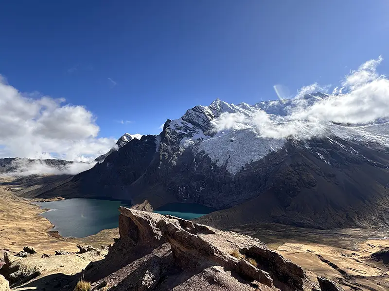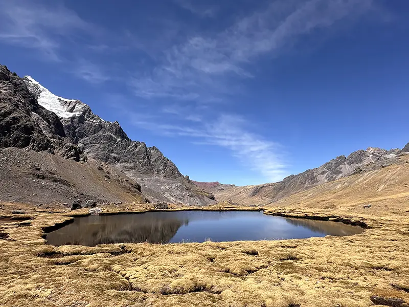 Después del desayuno, iniciaremos nuestra caminata alrededor de las 7:00 a. m. y continuaremos hacia el primer paso de montaña de nuestra ruta, el Abra Q’ampa, a 5100 m (16 732 pies), al que llegaremos después de aproximadamente 3 horas. Luego descenderemos durante 1 hora hacia las Lagunas Ticllaqocha, un hermoso conjunto de pequeñas lagunas turquesas junto a las cuales almorzaremos. Por la tarde, continuaremos nuestra caminata durante 2 a 3 horas más hasta llegar a Yanamayo, donde instalaremos nuestro campamento en un impresionante valle con vistas a los majestuosos picos Tres Picos, Colquecruz y Pucapunta.