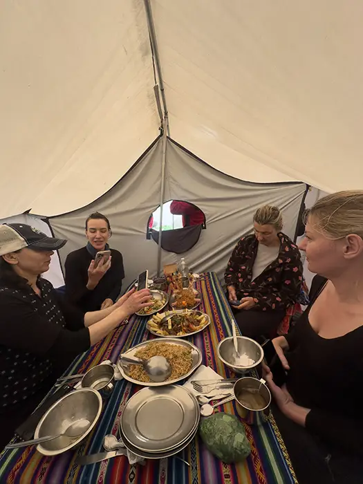A las 5:00 a. m., recibirás una llamada para despertarte temprano y continuar tu recorrido por el Camino Inca Sagrado. Disfruta de una bebida caliente servida en tu tienda, un comienzo acogedor para el día antes de levantarte para un desayuno nutritivo y abundante.