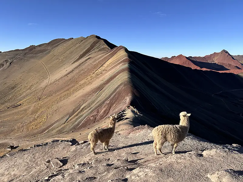 Recogida en el hotel a las 3:30 h; traslado privado (aprox. 3 h: 2 h asfaltadas + 1 h de terracería) hasta el inicio del sendero en Llacto; desayuno para llevar a la llegada; inicio del ascenso a la Montaña Arcoíris (aprox. 1 h, según el ritmo) con impresionantes vistas andinas y avistamientos frecuentes de llamas y alpacas; tiempo en la cumbre para fotos panorámicas (aprox. 30-60 min), si el clima y el ritmo del grupo lo permiten.